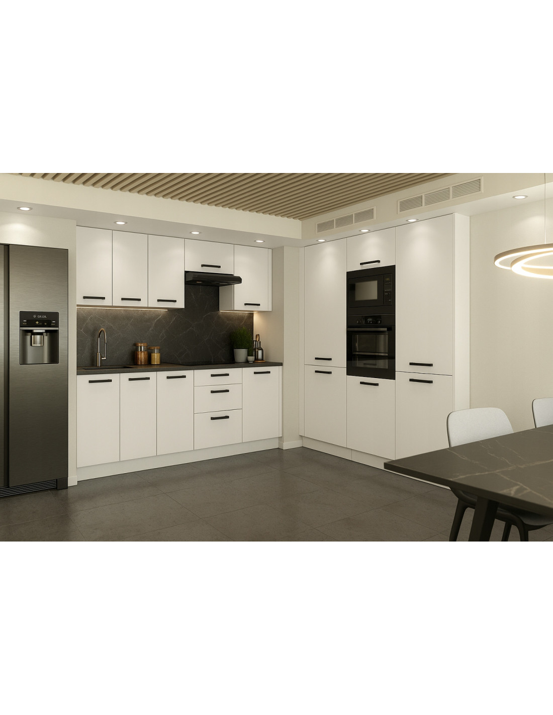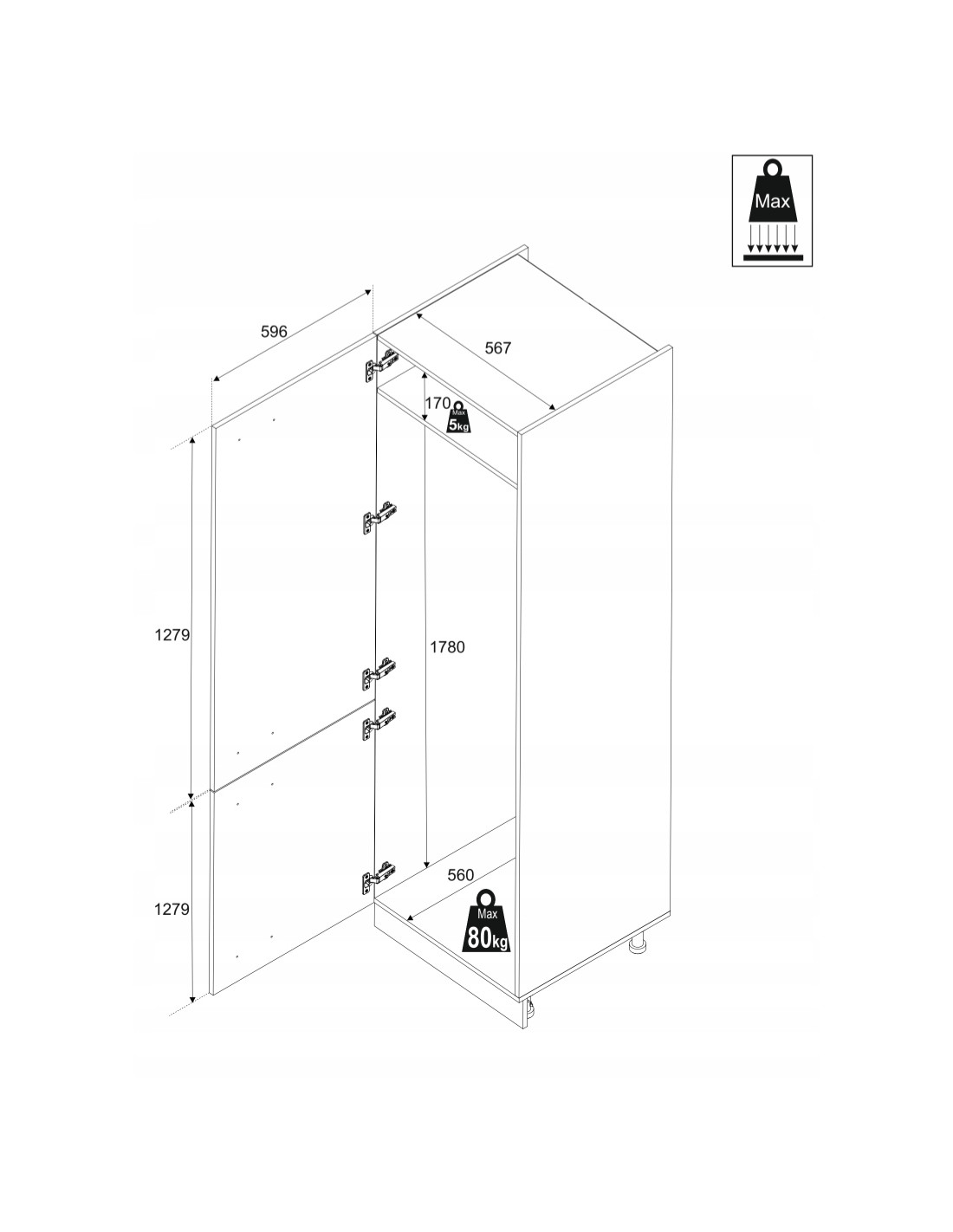 Słupek do zabudowy lodówki o wysokości 210 cm i szerokości 60 cm elegancko integruje chłodziarkę z linią mebli, zapewniając spójny wygląd kuchni oraz wygodne użytkowanie. Model wyposażony jest w dwa fronty: dolny do zamocowania na drzwiach urządzenia oraz górny – jako praktyczna nadstawka na zapasy i akcesoria. Solidna konstrukcja i przewidziane kanały wentylacyjne gwarantują bezawaryjną pracę lodówki oraz długą żywotność mebla.