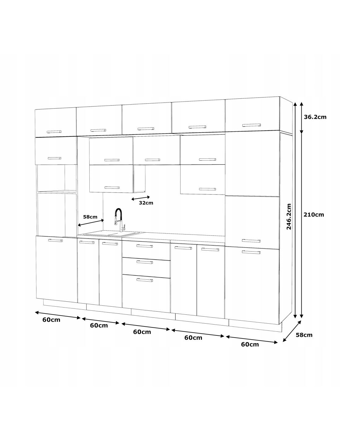- górne szafki mają 60 cm wysokości i 32 cm głębokości