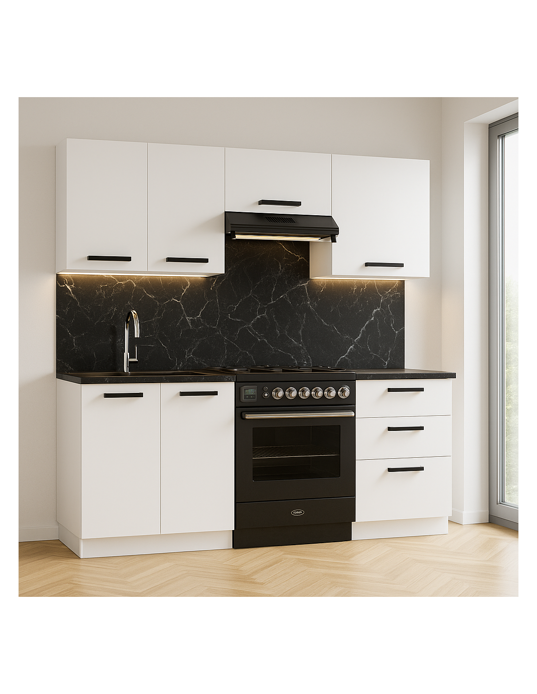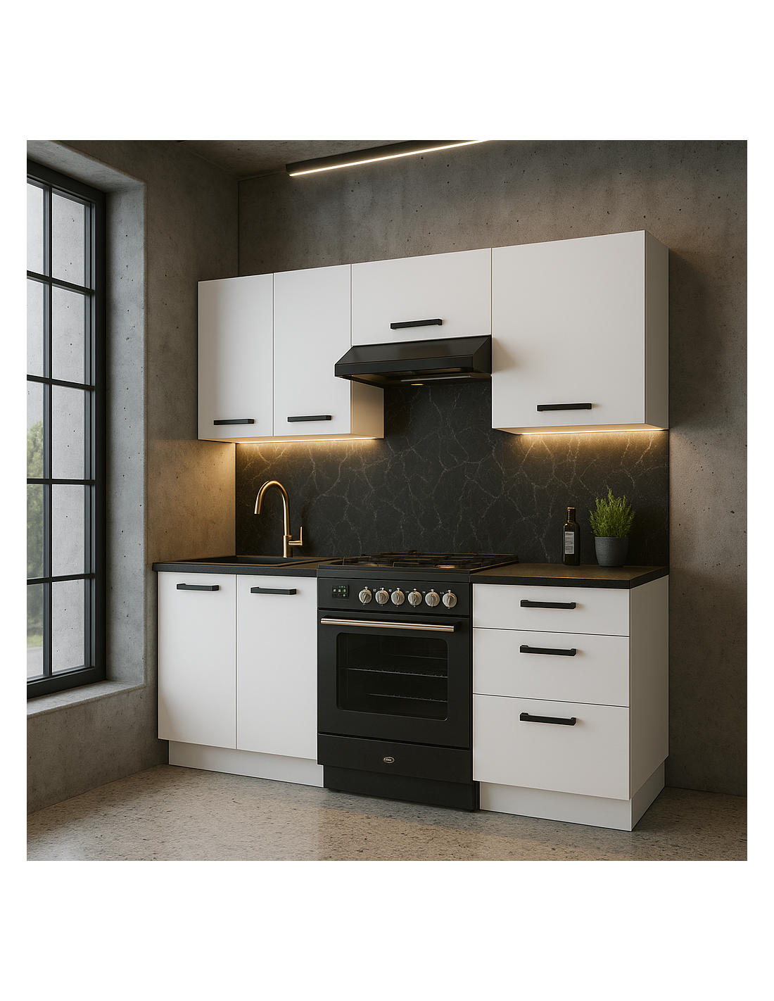 Praktyczny komplet ULWEHOME KUCHNIA BARCELONA 180cm w dekorze Biały Mat to nowoczesne, funkcjonalne i estetycznie wykończone meble kuchenne. Dzięki przemyślanemu układowi brył zyskujesz pojemne miejsce do przechowywania i wygodną organizację pracy. Fronty w ciepłym odcieniu drewna świetnie łączą się z białym korpusem, tworząc uniwersalny zestaw pasujący zarówno do wnętrz klasycznych, jak i minimalistycznych. Zestaw modułowy – szafki możesz zestawiać w dowolny układ, aby dopasować kuchnię do każdego pomieszczenia. W paczkach znajdziesz wszystkie niezbędne akcesoria, śruby i instrukcję montażu – złożysz meble bez problemu. Dostawa w paczkach do samodzielnego montażu.