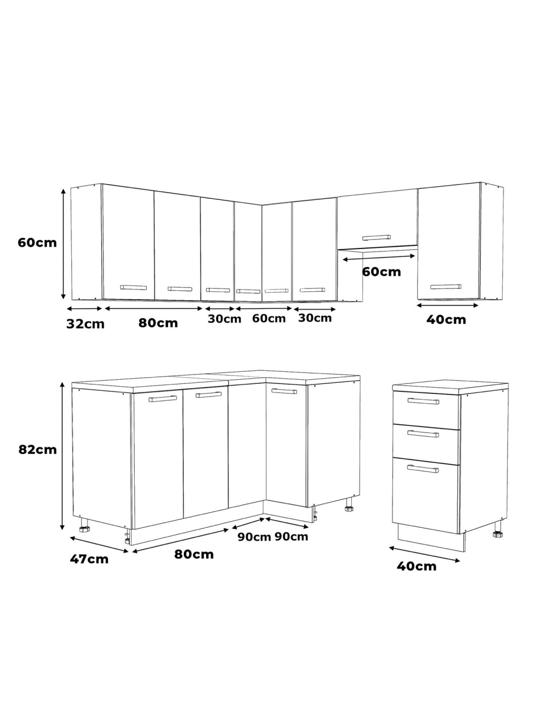 - Szafki górne: wysokość 60 cm, głębokość 32 cm