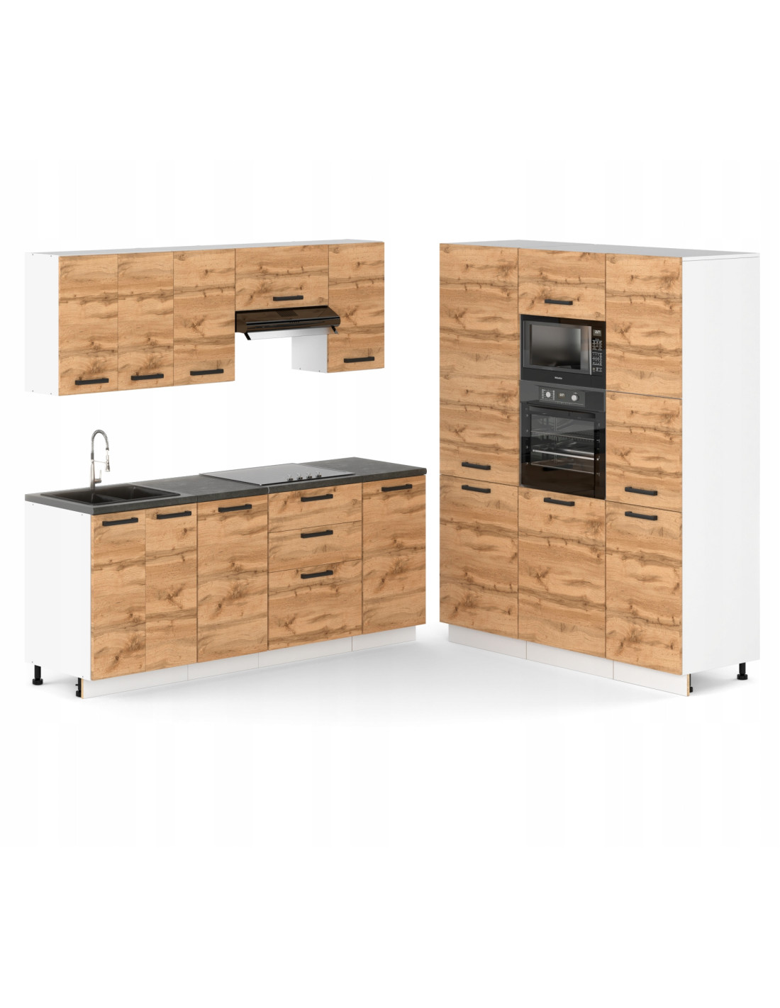 Praktyczny komplet ULWEHOME KUCHNIA Como Narożna w dekorze Dąb Wotan to nowoczesne, funkcjonalne i estetycznie wykończone meble kuchenne. Dzięki przemyślanemu układowi brył zyskujesz pojemne miejsce do przechowywania i wygodną organizację pracy. Fronty w odcieniu Dąb Wotan świetnie łączą się z białym korpusem, tworząc uniwersalny zestaw pasujący zarówno do wnętrz klasycznych, jak i minimalistycznych. Zestaw modułowy – szafki możesz zestawiać w dowolny układ, aby dopasować kuchnię do każdego pomieszczenia. W paczkach znajdziesz wszystkie niezbędne akcesoria, śruby i instrukcję montażu – złożysz meble bez problemu. Dostawa w paczkach do samodzielnego montażu.